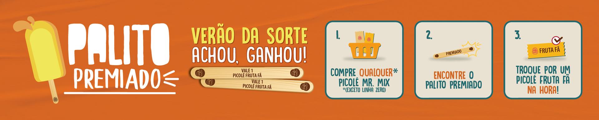 Compre um picolé Mr. Mix das linhas Fruta Fã, Creme Club, Chocolovers ou Top Premium e encontre palitos premiados com “Vale 1 Picolé Fruta Fã”.